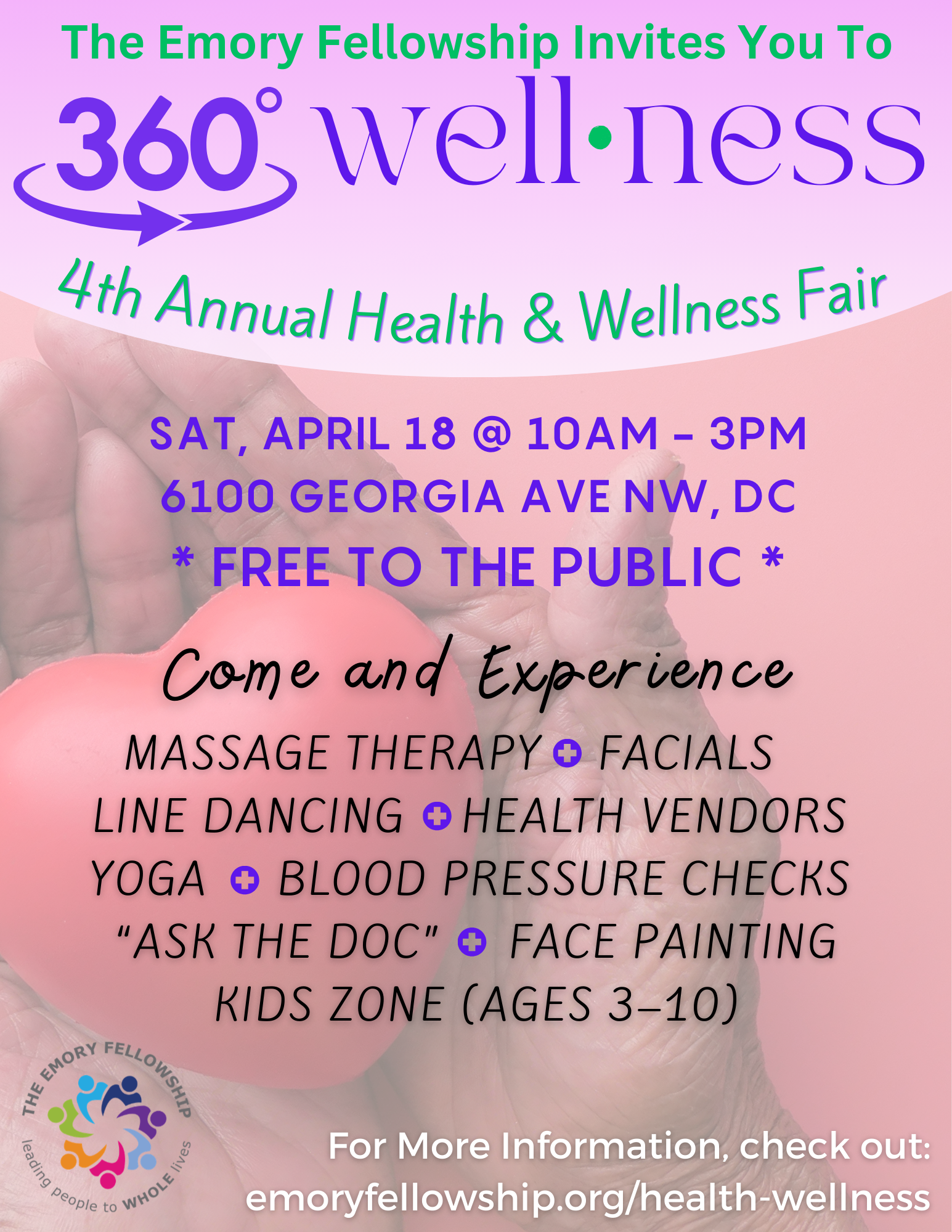 Health and Wellness Fair: Emory Fellowship United Methodist Church is having a "Health and Wellness Fair-360 Degrees" on Saturday, April 18 from 10 a.m. to 2 p.m. at Emory Fellowship UM Church, 6100 Georgia Avenue, NW, DC. There will be a variety of Physical, Spiritual, Mental and Social activities for adults as well as youth.