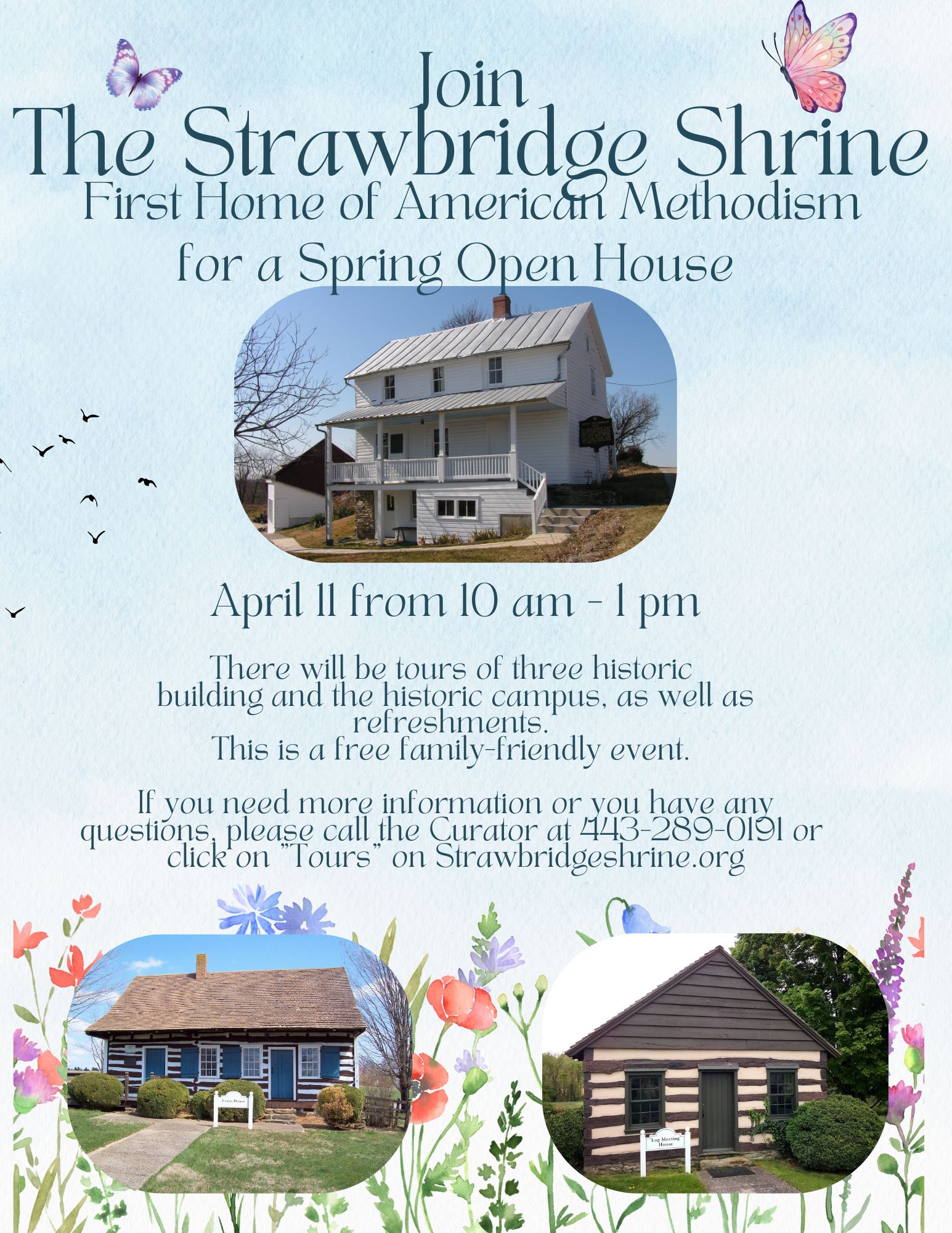 Spring Open House at The Strawbridge Shrine: Step back in history at the First Home of American Methodism. Join us on April 11 from 10 a.m. – 1 p.m. for a free, family-friendly event. Enjoy guided tours of three historic buildings, refreshments, and the beautiful historic campus. Bring your family and discover a piece of history. For more info, call 443-289-0191 or visit strawbridgeshrine.org