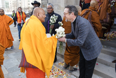 Shortly before noon, following their silent meal, the monks departed National UMC and continued on foot toward Washington National Cathedral for an interfaith gathering. During that gathering, The United Methodist Church was humbled to be thanked for its hospitality, as a Buddhist monk quoted Hebrews. Continuing, "A sanctuary is not opened by one person alone; it opens only when the whole community shares the same generosity."