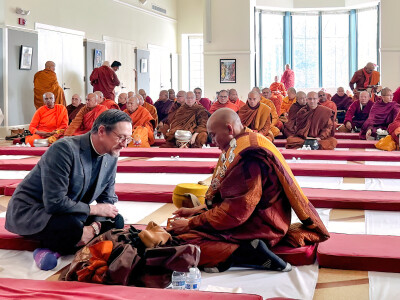 Inside, an estimated 300 Buddhist leaders and laypersons joined the monks in receiving their sole meal of the day in silence.