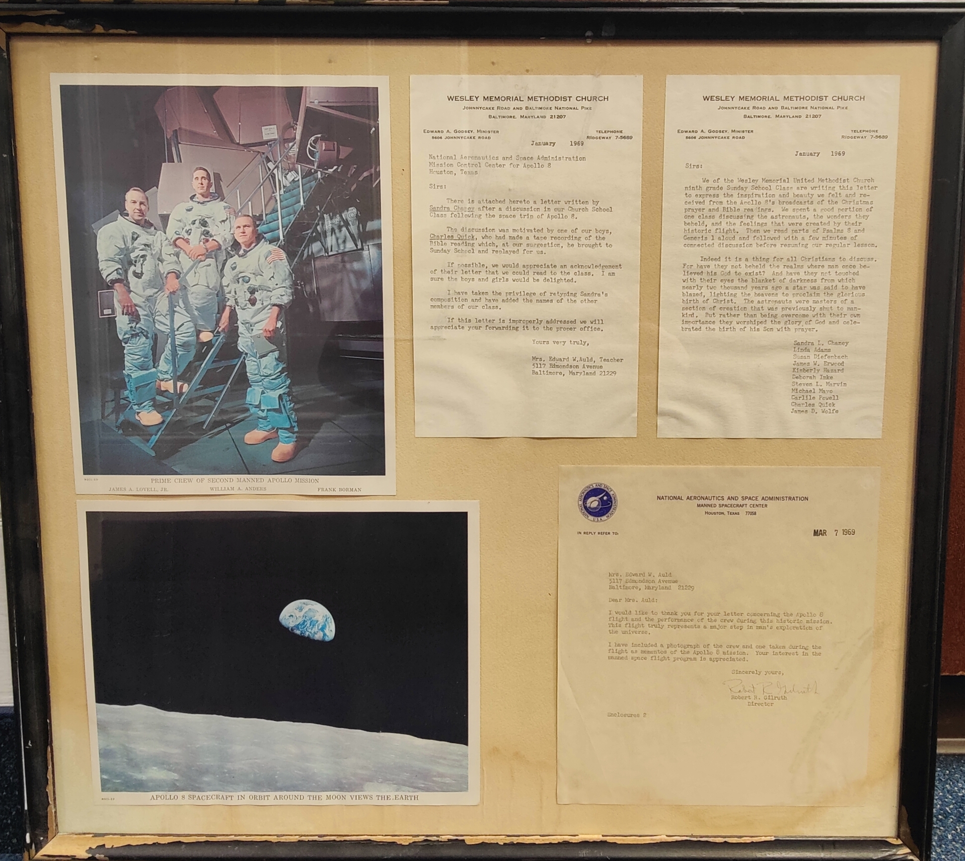 Recently uncovered from the archives of the Lovely Lane Museum is a framed collection of letters and images connected to Apollo 8, the groundbreaking mission of Dec. 21–27, 1968. Apollo 8 made history as the first crewed spacecraft to leave Earth’s gravitational pull and orbit the moon. While Apollo 11 would land on the lunar surface months later, Apollo 8 was the first time human beings witnessed Earth from deep space.