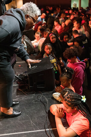Between scheduled sessions, students built friendships and deepened their sense of belonging. They made friendship bracelets, painted and colored together, played dodgeball, and took part in open mic moments as peers cheered them on. During open mic, the Hearts Ablaze Mission project was also in full swing, with a line of participants stretching around the exhibit hall and out the door.