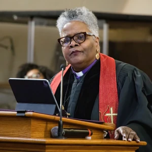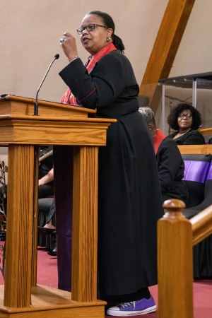 Bishop Delores J. Williamston of the Louisiana Conference preached on Jesus’ fourth word, “My God, my God, why have you forsaken me?” She drew the congregation into the raw reality of suffering, focusing on Christ’s anguished cry on Good Friday. She described it as a moment not of quiet reflection, but of deep abandonment, “a loud cry of pain and anguish” that named what it feels like to be disowned, dropped, and left alone. In that moment, she said, even the heavens were silent. Yet rather than diminishing faith, Jesus’ cry revealed its depth. “It takes courage and gumption to holler,” she said, inviting the congregation into that same honesty before God. As attendees responded with a resounding “HOLLER,” Williamston affirmed that believers are given permission to cry out in their own moments of suffering and uncertainty.